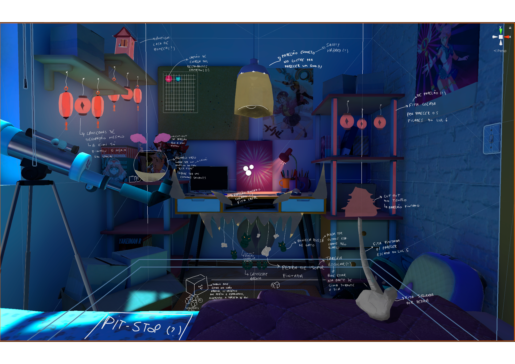 Based on my childhood memories, this is an exercise proposed by Kako, the game director, of how a kid’s immagination can physically manifest in their bedroom, the starting point of the game, and how that relates to each of the six initially proposed levels.