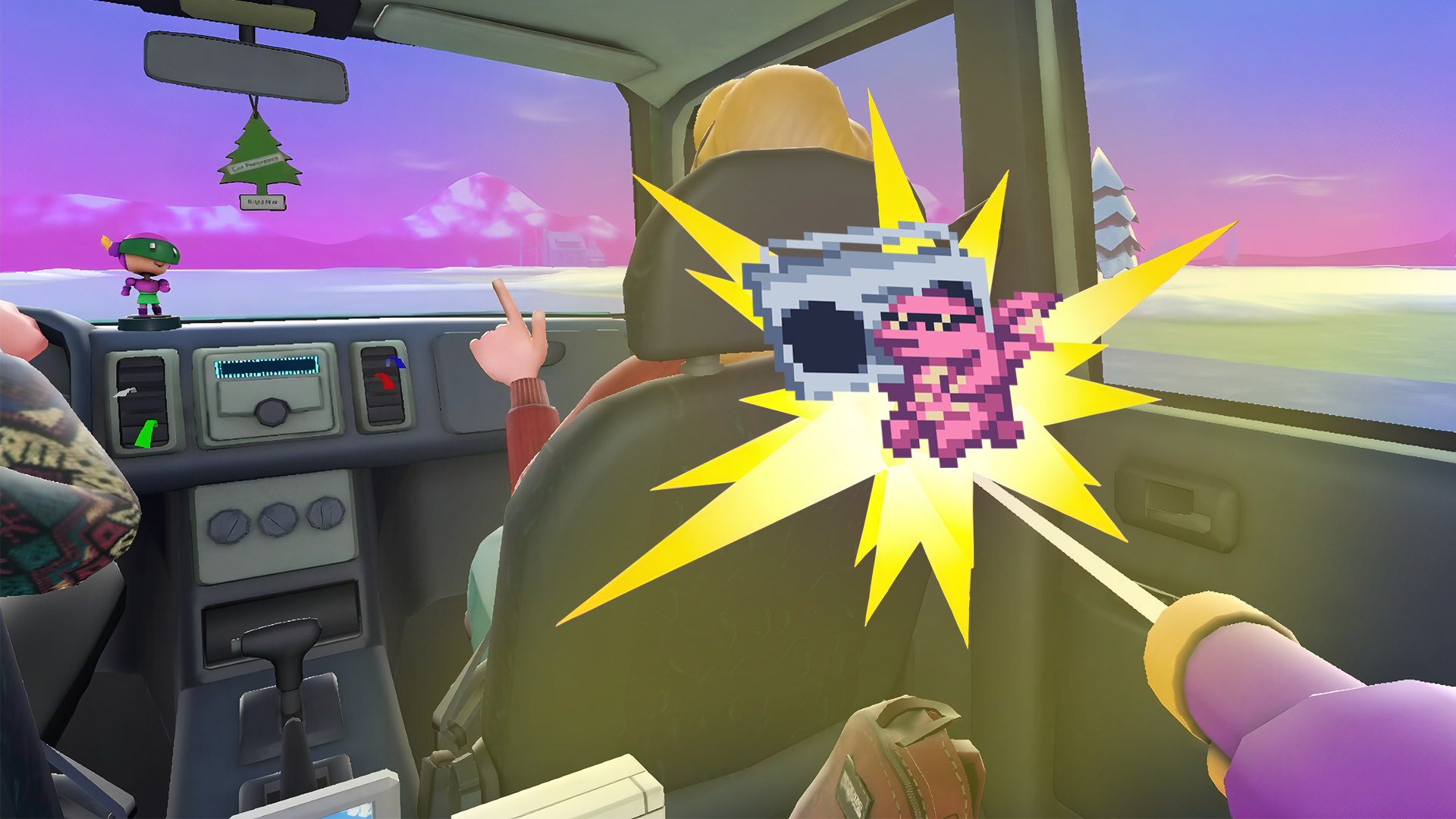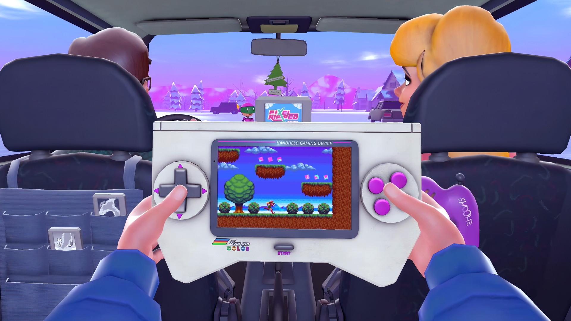 Armed with his new Gear Kid Color, David must unlock cartridges to save each of Dot’s friends while iconic road trip moments — from I Spy to car sing-alongs — blur the line between the Human and Game Worlds. Packed with humor, nostalgia, and meta twists, the game offers a playful new perspective on a VR classic, all set within the confines of the Keane family car.